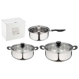 Набор посуды из 5 предметов PROMO: 2 кастрюли 1,25 л+2,2 л (с крышками)+ ковш 1,25 л (без крышки) Материал: нерж сталь, жаропрочное стекло, нейлон. Толщина стенок 0,3 мм, объемы: 1,25 л кастрюля, 2,2 л кастрюля, 1,25 л ковш. Размеры: 17,5*7,5 см/21,5*8,5см/17,5*7,5 см. (Диаметр*высота без крышки). Размеры с ручками: 30,7/24,3/28,4 см. Высоты крышек с ручками: 7,8/12,0/12,6 см. Дно однослойное. Подходит для всех типов плит. Не рекомендуется мыть в посудомоечной машине. Зеркальная полировка корпуса внутри и снаружи. Отметки литража. Ручки: нерж сталь+ нейлон. Крышка из жаропрочного стекла с отверстием для выпуска пара. Упаковка: стикер+белая коробка.