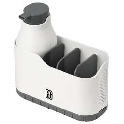Набор: диспенсер с отсеками для хранения 3 отсека для хранения Вспенивающий дозатор Сборная конструкция Слив воды Материал: полистирол HIPS, полиэтилентерефталат PET, сталь SS (пружинка в дозаторе). Размер: 18,2 х 8,2 х 18 см Объем дозатора: 200 мл Цвет: белый с серым