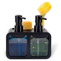 Набор: 2 диспенсера с отсеками для хранения 2 прозрачных диспенсера 2 отсека для хранения губки и щетки Сборная конструкция Слив воды Материал: полипропилен PPG, полистирол HIPS, силикон, сталь SS (пружинка в дозаторе). Размер: 16,9 х 17,2 х 9,5 см Объем 1 дозатора: 350 мл Цвет: черный