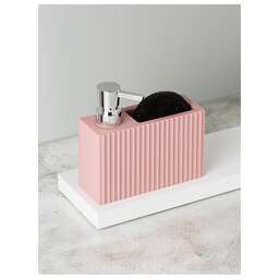 Диспенсер для мыла с карманом под губку Отсек для хранения губки Прорезиненное покрытие Губка в комплекте Материал: ABS-пластик прорезиненный, полипропилен. Размер: 16,5 х 6 х 15,5 см Объем дозатора: 220 мл Цвет: розовый