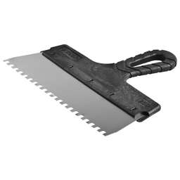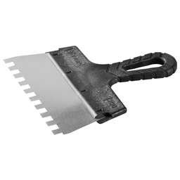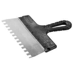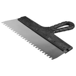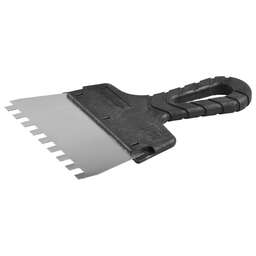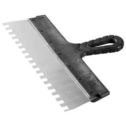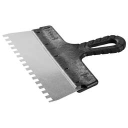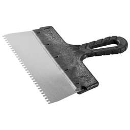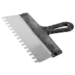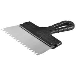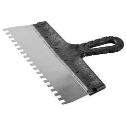 Благодаря зубчатой кромке шпатель идеально подходит для работы со строительными и клеевыми смесями, полотно из нержавеющей стали обеспечивает надежность и долгий срок службы инструмента, а удобная пластмассовая рукоятка создает условия для комфортной работы Преимущества Нержавеющее полотно Пластмассовая рукоятка Использование Для нанесения и выравнивания строительных и клеевых смесей