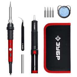 Благодаря продуманной системе управления, паяльные станции ЗУБР позволяют быстро илегко выполнять работы любой сложности, как в профессиональной мастерской, так и в домашних условиях. Предназначены для работы с электронными платами при монтаже/демонтаже компонентов, а также для пайки проводников, отпайки илужения. Преимущества Высококачественный керамический нагревательный элемент длябыстрого достижения необходимой температуры жала • Компактный размер 11-в-1 все необходимое в одном наборе Кнопка включения/выключения питания Гибкий шнур для удобства работы Компактная сумка для удобства перенски и хранения Использование Паяльная станция применяется для паяльных работ, требующих бережную пайку при определенной температуре. Станция особенно удобна при пайке электронных плат и других мелких деталей, поскольку поддерживает заданную температуру и не нуждается в отключении от электросети во время работы. Выключатель обеспечивает удобство эксплуатации паяльной станции. Подставка, поставляемая в комплекте, удобна при выполнении паяльных работ и обеспечивает безопасность.
