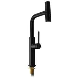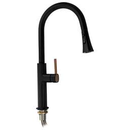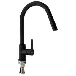 Смеситель для кухонной мойки и раковин, вытяжной излив - лейка с переключением режимов подачи воды, литой корпус черного цвета, из латуни, шаровый. Крепление резьба - гайка, картридж d = 35 мм, ручка литая. Аэратор для экономии воды. Такая модель может использоваться на домашней кухне, на даче, в медицинских учреждениях и общественных местах. Габаритные размеры: высота 220 мм, длина 230 мм, посадочное седло 50*50 мм. Вес - 2,450 кг, объём - 0,01633 м3. В комплекте паспорт, корпус с изливом, подводка 1/2, крепеж, набор прокладок.