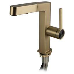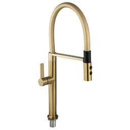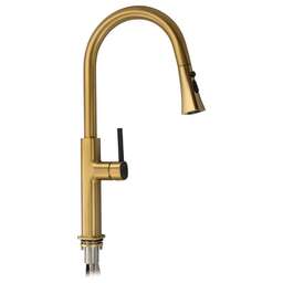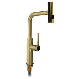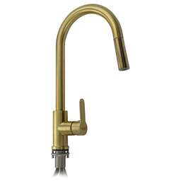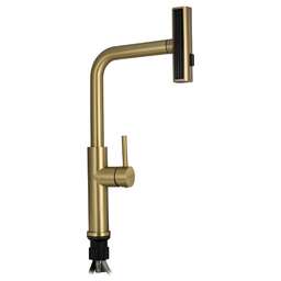 Смеситель для кухонной мойки и раковин, вытяжной излив - лейка с переключением режимов подачи воды, литой корпус под цвет матового золота, из латуни, шаровый. Крепление резьба - гайка, картридж d = 35 мм, ручка литая. Аэратор для экономии воды. Такая модель может использоваться на домашней кухне, на даче, в медицинских учреждениях и общественных местах. Габаритные размеры: высота 220 мм, длина 230 мм, посадочное седло 50*50 мм. Вес - 2,45 кг, объём - 0,01633 м3. В комплекте паспорт, корпус с изливом, подводка 1/2, крепеж, набор прокладок.