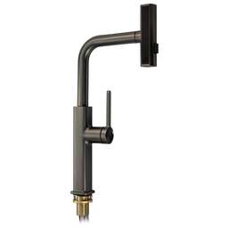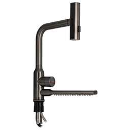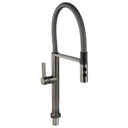 Смеситель для кухонной мойки и раковин, вытяжной излив - лейка с переключением режимов подачи воды, литой корпус под цвет графита, из латуни, шаровый. Крепление резьба - гайка, картридж d = 35 мм, ручка литая. Аэратор для экономии воды. Такая модель может использоваться на домашней кухне, на даче, в медицинских учреждениях и общественных местах. Габаритные размеры: высота 220 мм, длина 230 мм, посадочное седло 50*50 мм. Вес - 2,450 кг, объём - 0,1633 м3. В комплекте паспорт, корпус с изливом, подводка 1/2, крепеж, набор прокладок.