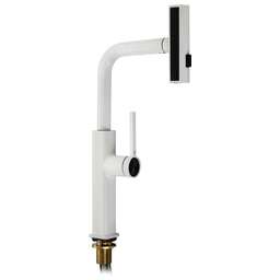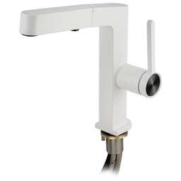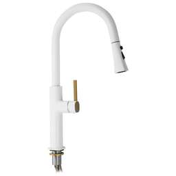Смеситель для кухонной мойки и раковин, вытяжной излив - лейка с переключением режимов подачи воды, литой корпус белого цвета, из латуни, шаровый. Крепление резьба - гайка, картридж d = 35 мм, ручка литая. Аэратор для экономии воды. Такая модель может использоваться на домашней кухне, на даче, в медицинских учреждениях и общественных местах. Габаритные размеры: высота 220 мм, длина 230 мм, посадочное седло 50*50 мм. Вес - 2,450 кг, объём - 0,01633 м3. В комплекте паспорт, корпус с изливом, подводка 1/2, крепеж, набор прокладок
