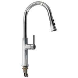 Смеситель для кухонной мойки и раковин, вытяжной излив - лейка с переключением режимов подачи воды, литой хромированный корпус, из латуни, шаровый. Крепление резьба - гайка, картридж d = 35 мм, ручка литая. Аэратор для экономии воды. Такая модель может использоваться на домашней кухне, на даче, в медицинских учреждениях и общественных местах. Габаритные размеры: высота 220 мм, длина 230 мм, посадочное седло 50*50 мм. Вес - 2,5 кг, объём - 0,01461 м3. В комплекте паспорт, корпус с изливом, подводка 1/2, крепеж, набор прокладок.