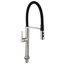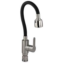 Смеситель для кухонной мойки с гибким чёрным рельефным изливом с магнитной фиксацией, двухрежимный аэратор, литой корпус цвета сатин, из нержавеющей стали марка SUS 304. Крепление резьба - гайка, картридж d = мм, ручка шток. Аэратор для экономии воды. Такая модель может использоваться на домашней кухне, на даче, в медицинских учреждениях и общественных местах. Габаритные размеры: высота 530 мм, длина 260 мм, диаметр посадочного седла 50 мм, длина резьбы 60 мм, длина подводки 500 мм. Вес - 2.28 кг, объём - 0.01092 м3. В комплекте паспорт, корпус с изливом, подводка 1/2, крепеж, набор прокладок.