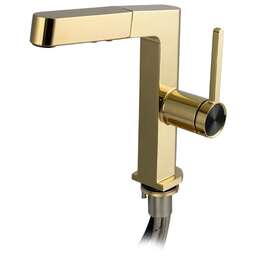 Смеситель для кухонной мойки и раковин, вытяжной излив - лейка с переключением режимов подачи воды, литой корпус под цвет глянцевого золота, из латуни, шаровый. Крепление резьба - гайка, картридж d = 35 мм, ручка литая. Аэратор для экономии воды. Такая модель может использоваться на домашней кухне, на даче, в медицинских учреждениях и общественных местах. Габаритные размеры: высота 220 мм, длина 230 мм, посадочное седло 50*50 мм. Вес - 2,450 кг, объём - 0,01633 м3. В комплекте паспорт, корпус с изливом, подводка 1/2, крепеж, набор прокладок.