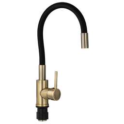 Смеситель для кухонной мойки и раковин, литой матовый корпус, цвет золото из нержавеющей стали марки 304, с высоким гибким изливом черного цвета, с аэратором для экономии воды, шаровый. Крепление резьба - гайка, картридж d = 35 мм, ручка литая. Такая модель может использоваться на домашней кухне, на даче, в медицинских учреждениях и общественных местах. Габаритные размеры: высота до 400 мм, длина до 200 мм, диаметр посадочного седла 40 мм, длина резьбы 55 мм, длина подводки 600 мм. Вес - 1,0 кг, объём - 0,00543 м3. В комплекте паспорт, корпус с изливом, подводка 1/2, крепеж, набор прокладок.