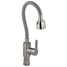 Смеситель для кухонной мойки и раковин, литой матовый корпус, из нержавеющей стали марки 304, с высоким гибким изливом серого цвета, с двухрежимным аэратором для экономии воды, шаровый. Крепление резьба - гайка, картридж d = 35 мм, ручка литая. Такая модель может использоваться на домашней кухне, на даче, в медицинских учреждениях и общественных местах. Габаритные размеры: высота до 400 мм, длина до 200 мм, диаметр посадочного седла 45 мм, длина резьбы 55 мм, длина подводки 450 мм. Вес - 1.8 кг, объём - 0.00410 м3. В комплекте паспорт, корпус с изливом, подводка 1/2, крепеж, набор прокладок.