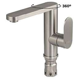 Смеситель для раковины, из нержавеющей стали марки SUS 304, литой корпус с прямым поворотным плоским изливом, цвет сатин, ручка литая, шаровый. Крепление резьба - гайка, картридж d = мм. Аэратор для экономии воды. Такая модель может использоваться на домашней кухне, на даче, в медицинских учреждениях и общественных местах. Габаритные размеры: высота 170 мм, длина 190 мм, глубина 90 мм, посадочное седло 45 мм, длина резьбы 60 мм, длина подводки 500 мм. Вес - 1,9 кг, объём - 0,00319 м3. В комплекте паспорт, корпус, подводка 1/2, крепеж, набор прокладок.