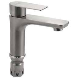 Смеситель для раковины, матовый литой корпус, из нержавеющей стали марки 304, с коротким литым изливом, литая ручка, шаровый. Крепление резьба - гайка, картридж d = 40 мм. Аэратор для экономии воды. Такая модель может использоваться на домашней кухне, на даче, в медицинских учреждениях и общественных местах. Габаритные размеры: высота 155 мм, длина 165 мм, длина излива 120 мм, диаметр посадочного седла 50 мм, длина резьбы 60 мм, длина подводки 450 мм. Вес - 1,350 кг, объём - 0,00200 м3. В комплекте паспорт, корпус, подводка 1/2, крепеж, набор прокладок.