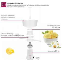 Размер прибора: 324х288х472мм (ШхГхВ).Размер прибора в упаковке: 210х430х300мм (ШхГхВ) Мощность 80 Вт.Номинальное напряжение 220 В.Частота сети питания 50 Гц.Прибор из пищевого пластика.Объем приемника молока 5,5 л Частота вращения барабана 11000 об/мин +15000. 14000 об/мин.Время беспрерывной работы 60 мин.Производительность 80 л/ч.Регулировка жирности и густоты сливок.Барабан содержит 11 тарелок.