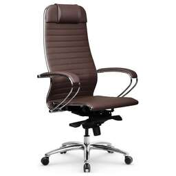 Спинка: замкнутая высокая хромированная, ширина 510 мм Подлокотники: стальные хромированные, с мягкими накладками Сиденье: на стальном хромированном каркасе, ширина 510 мм Материалы обивки: Износостойкий материал MPES на подлокотниках и подголовнике, на спинке-с прошивкой К1, на сиденье-с прошивкой К1 Подголовник: мягкий комфортный из износостойкого материала MPES, комплектуется дополнительной подушкой, увеличивающей объем подголовника Регулируемый поясничный подпор: стальной хромированный с ремнем из экокожи MPRU Базовые цвета материалов обивки спинки/накладок подлокотников/сиденья: темно-коричневый/темно-коричневый/темно-коричневый Синхромеханизм: MULTIBLOCK со слайдером Пятилучье: зеркальное литое с округленным сечением лучей, D-700 мм Ролики: противооткатные с полиуретановым ободком, D-60 м