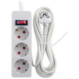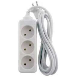 Колодка сетевого фильтра на 3 розетки. Материал колодки - негорючий РР-пластик белого цвета. С заземлением. Защита от детей. Удобная электровилка. Сила тока 10 А. Кнопка включения. Сечение провода 3х0,75 мм2. Длина провода 3,0 м.