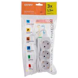Сетевой удлинитель, который подходит для оснащения питанием рабочего места в офисе либо в домашних условиях. Рассчитан на подключение до 3-х электроустройств максимальной суммарной мощностью 3500 Вт. Удлинитель оснащен удобными выключателями питания на каждое сетевое гнездо. Сетевой удлинитель при малой длине кабеля в 1,5 метра удобно использовать для подключения стационарных электроприборов, размещенных на небольшой площади. Каждое гнездо оснащено выключателем для отдельного отключения одного электроприбора, без отсоединения удлинителя от сети. Данное решение удобно в случае труднодоступности сетевой розетки. Удлинитель укомплектован заземлением, которое позволяет избежать поражения электрическим током и короткого замыкания. Разъемы закрыты специальными шторками, ограничивающими попадание пыли и мелких частиц на контакты.Материал корпуса выполнен из ударопрочного поликарбоната, относящегося к негорючим материалам."