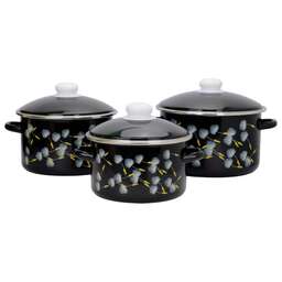 Набор из трех кастрюль цилиндрических 2,0 3,0 4,0л со стеклянными крышками. Материал: эмалированная сталь Толщина дна: 0.7 Источник тепла: Все виды плит Внутреннее покрытие: эмаль Внешнее покрытие: эмаль