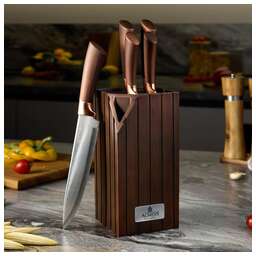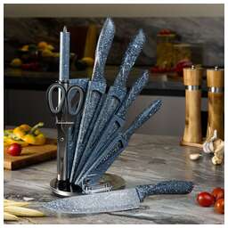 Эргономичная ручка с покрытием Soft Touch для удобной нарезки. 2-х стороняя заточка лезвия.Состав набора: Топорик 16,5см, Нож поварской 20см, Нож для нарезки 20см, Нож универсальный 12,5см, Нож для чистки овощей и фруктов, 9см, Муссат, Ножницы, Складывающаяся вращающаяся пластиковая подставка для безопасного хранения ножей.