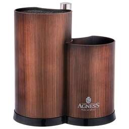 Подставка для ножей необходимый аксессуар на каждой кухне. Подставка легко и удобно решает проблему хранения ножей, защищая лезвия ножей от загрязнения. Дополнительный отсек можно использовать для хранения различных кухонных аксессуаров. Подставка для кухонных принадлежностей подходит для стандартных бумажных полотенец в рулонах.<br /> Преимущества подставки AGNESS:<br /> * Долговечность. Подставка выполненна из высококачественного пластика и прочного полимера - графито-каучука, который помогает сохранить остроту кромки ножа.<br /> * Практичность. Внутренняя часть съемная, при необходимости ее можно промыть и просушить.Рекомендуется сушить подставку в разобранном виде.<br /> * Универсальность. Подходит для ножей различной длины.<br /> * Стильный дизайн.<br /> Высота подставки для ножей 25см, высота подставки для кухонных принадлежностей 16см, высота держателя для полотенец 25с