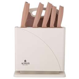 Нож - главный инструмент на кухне, а вернее ножи, т.к. даже самый лучший нож не сможет справиться со всем многообразием задач. Выбирая набор ножей AGNESS - Вы приобретаете комплект самых необходимых и чаще всего используемых ножей. Преимущества ножей AGNESS:<br /> Лезвие из высокоуглеродистой коррозионной стали<br /> Эргономичная ручка с покрытием Soft Touch для удобной нарезки<br /> 2-х стороняя заточка лезвия<br /> Удобная вращающаяся подставка<br /> Для экономии рабочего пространства Вы легко можете сложить подставку<br /> Состав набора: Топорик 17см, Нож поварской 20см, Нож для нарезки 20см, Нож универсальный 12,5см, Нож для чистки овощей и фруктов, 9см, Муссат, Ножницы, Складывающаяся вращающаяся пластиковая подставка для безопасного хранения ножей.<br /> Рекомендована ручная мойка.