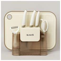 Нож - главный инструмент на кухне, а вернее ножи, т.к. даже самый лучший нож не сможет справиться со всем многообразием задач. Выбирая набор кухонных предметов AGNESS - Вы приобретаете комплект самых необходимых и чаще всего используемых ножей, ножницы разделочную доску и тёрку. <br /> Преимущества ножей AGNESS:<br /> ? Эргономичная ручка с покрытием Soft Touch для удобной нарезки<br /> ? Лезвие из высокоуглеродистой коррозионной стали<br /> ? 2-х стороняя заточка лезвия<br /> ? Удобная подставка<br /> ? Для экономии рабочего пространства Вы легко можете хранить все предметы набора в подставке<br /> <br /> <br /> Состав набора: нож для нарезки 28 см, нож сантоку 26 см, нож для овощей и фруктов 21 см, овощечистка 14 см, ножницы кухонные 21 см, подставка 25х9,2х18,8 см, разделочная доска 38х28х0,8 см