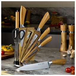 Представляем вам уникальный набор из 9 предметов, созданный специально для вашей кухни. Этот стильный набор приборов разработан с учетом современных требований к столовой посуде и является идеальным выбором для вашей кухни. Набор для кухни - это отличный аксессуар для вашего кухонного пространства, который обеспечит удобство системы хранения и дополнит ваш интерьер. Настольные наборы инвентаря для кухни могут использоваться для приготовления различных блюд. Ножи разного размера можно использовать как для разделывания мяса и рыбы, так и для овощей и фруктов. Острые лезвия ножей имеют гладкую и легко очищаемую поверхность. В подставке для кухонной утвари Вы сможете хранить все кухонные штучки, мелочи и нужные предметы. Красивый набор кухонных предметов займет достойное место на любой кухне, добавит стиля и уюта в ваш дизайн и внесет современный декор в интерьер.<br /> Можно мыть в ПММ.