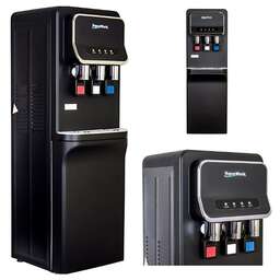 Напольный кулер для воды Aqua Work V93-W с нагревом, охлаждением электронного типа и небольшим шкафчиком в черном матовом корпусе из стали. Технические данные: Нагрев воды: есть Мощность: 550 Вт Нагревает: 90-96 °С, не менее 5л/ч Охлаждение: электронное Мощность: 75 Вт Охлаждает: ≤ 15 °С, не менее 0.7л/ч Подача воды: нажатием кружкой Краников: 3 Место в корпусе: шкафчик, объемом 12л Установка бутыли: сверху Индикация работы: светодиоды Управление: тумблеры вкл/выкл Стаканодержатели: на шурупах, на магнитах Габариты аппарата: 97x35x31 см Вес: 8,2 кг