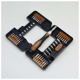 Набор отверток для точечных работ BERKUT SPECIALIST BS-SET9137 (37 предметов) предназначен для выполнения прецизионных работ. Биты набора выполнены из хромованадиевой стали. Эргономичная двухкомпонентная рукоятка отвертки делает работу с инструментом легкой и удобной. Магнитный держатель обеспечивает быструю замену и надежную фиксацию насадок. В комплекте идет набор бит (4х28 mm) 1/8’’ 28 штук (с прямым шлицем SL, крестовыми шлицами PH/PZ, внутренним шестигранником HEX и звездочкой TORx®), а также биты с торцевыми головками 1/8’’ 7 штук. Комплектация: Пластиковый кейс Отвертка для точных работ-1 шт БИТЫ (4x28mm) 28 шт: - SL1.0mm, SL1.5mm, SL2.0mm, SL2.5mm, SL3.0mm, SL3.5mm - PH000, PH00, PH0, PH1 - PZ0, PZ1 - T4, T5, T6, T7, T8, T9, T10, T15, T20 - H0.7, H0.9, H1.3, H2, H2.5, H3, H4 БИТЫ С ТОРЦЕВЫМИ ГОЛОВКАМИ 7 шт: - 2.5mm, 3.0mm, 3.5mm, 4.0mm, 4.5mm, 5.0mm, 5.5mm Упаковочная коробка Функциональные особенности: - Отвертка для точных работ в комплекте с набором бит (с прямым шлицем SL, крестовыми шлицами PH/PZ, внутренним шестигранником HEX и звездочкой TORx®), а также биты с торцевыми головками в пластиковом кейсе - Материал: Сталь HRC 51-54, CrV6150 - Цвет: Чёрный - Размеры: 155x10x27 мм - Вес: 200 г