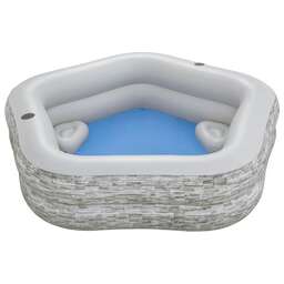 Небольшой надувной бассейн у вас во дворе соберёт всех вместе и станет центром зоны отдыха. В жаркий день взрослый и ребёнок будут рады освежиться. Чтобы разместиться комфортно, на широких бортиках установлены две подушечки под голову и два сидения, а также встроены два подстаканника. возраст: от 6 лет. форма: пятиугольная. материал: ПВХ. объём: 575 л. есть клапан для слива воды.Заплатка для ремонта. Сливной клапан. Глубина (метр) 0.4. Ширина (метр) 0.4. Высота (метр) 0.15. Производитель Bestway.