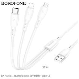 Дата-кабель Borofone BX71 представляет собой USB кабель с тремя выходами: Lighting 8-pin, USB Type-C и micro USB. Он позволит заряжать или синхронизировать с ПК одновременно три разных устройства. Выполнен кабель из высококачественных материалов, потому прослужит очень долго. Кабель находится в прочной оплетке, которая предотвратит перетирание или перегибание кабеля по длине и возле коннекторов.