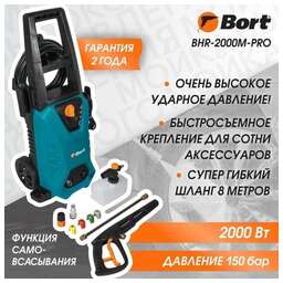 Мойка высокого давления; Потребляемая мощность 2000 Вт; Максимальное давление 150 бар; Рабочее давление 120 бар;Материал корпуса насоса Силумин; Максимальная производительность 450 л/час; Функция автоматического всасывания; автостоп; Шланг 8 м; Длина шнура питания 5 м; Напряжение 220 В; Частота тока 50 Гц; Вес изделия 6,4 кг; Вес брутто=9,3 (Вес нетто=8,1) кг; 35 x 32,1 x 50; набор аксессуаров 10 шт; Функция самовсасывания, Быстросъемное подключение аксессуаров, Автоматическое отключение при перегреве., Увеличенная длина шланга 8м; гарантия 2 г
