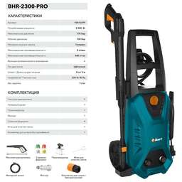 Мойка высокого давления; Потребляемая мощность 2300 Вт; Максимальное давление 170 бар; Рабочее давление 130 бар; Материал корпуса насоса Силумин;Максимальная производительность 480 л/час; Функция автоматического всасывания; автостоп; Шланг 8 м; Длина шнура питания 5 м; Напряжение 220 В; Частота тока 50 Гц; Вес изделия 7,4 кг; Вес брутто=10,3 (Вес нетто=9,1) кг; 35 x 32,1 x 50; набор аксессуаров 10 шт; Функция самовсасывания, Быстросъемное подключение аксессуаров, Автоматическое отключение при перегреве., Увеличенная длина шланга 8м; гарантия 2 г