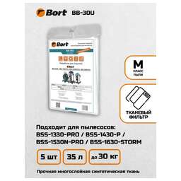 Комплект бумажных пылесборников для пылесоса Bort BSS-1330-Pro. Бумажные мешки изготавливаются из двух слоев неотбеленной, многослойной фильтровальной бумаги, что позволяет им удерживать пыль до 1-3 микронов. Первый слой задерживает основную часть мусора, второй – самые мелкие частицы пыли. Сочетание двух слоев обеспечивает намного более качественную фильтрацию воздуха, по сравнению с тканевым пылесборником. Бумажные пылесборники оснащены специальными затворами, которые препятствуют попаданию пыли в легкие после извлечения наполненного мешка из пылесоса.