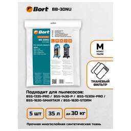 Набор из прочных фильтр-мешков из многослойной синтетической ткани повышенной плотности. Позволяют собирать мельчайшие частицы пыли, влажный и строительный мусор. Класс фильтрации М. Количество в упаковке, шт: 5.Подходит: BSS-1015