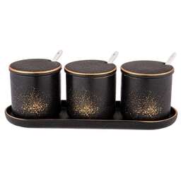 Коллекция "MIDNIGHT GOLD" ТМ BRONCO - это ультрамодная сервировка стола. Черный с золотыми брызгами и окантовкой фарфор. Глубокое матовое покрытие. Каждый предмет коллекции уникален. Тарелки в виде форм для запекания, сковородок, чугунков, элементы поверхности гриль на дне изделий - все это делает Ваш стол неповторимым Посуда прошла сертификацию. Безопасна для контакта с пищевыми продуктами. С осторожностью использовать изделия в посудомоечной машине и микроволновой печи по причине возможного повреждения золотого декоративного покрытия. Рекомендуется применять мягкие средства для мытья в посудомоечной машине. Комплектность: банка с крышкой и ложкой 8*8 см 250 мл - 3 шт, подставка фарфоровая 27,5*9,5*2 см - 1 шт.