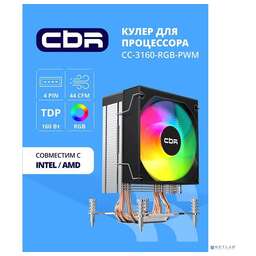 [Охлаждающие системы CBR] CBR-CC-3160-RGB-PWM Кулер для процессора, Al+Cu, 3 heat pipes, Socket 775/1366/1155/1156/1150/1151/1200/1700/AM2/АМ2+/АМ3/AM3+/FM1/FM2/AM4/AM5, TDP 160W, 90mm Fan, 2600RPM, HB, RGB, PWM, 32db