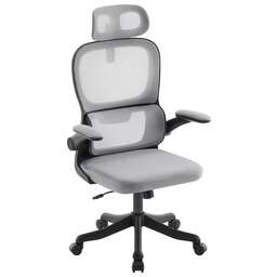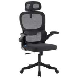 Удобное офисное кресло с подголовником и мягкими подлокотниками, сетчатой спинкой и поясничным упором. Благодаря специальной конструкции подлокотники откидываются вверх. Кресло оборудовано механизмом качания.