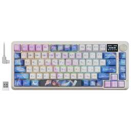 Компактная игровая механическая клавиатура на тихих переключателя SNK White, с прозрачными кейкапами и RGB подсветкой. Модель имеет 3 режима подключения: проводной, беспроводной по радио-каналу 2.4ГГц (с помощью USB-адаптера), а также подключение по Bluetooth. Также клавиатура имеет кнопку-регулятор для управления громкостью и подсветкой.