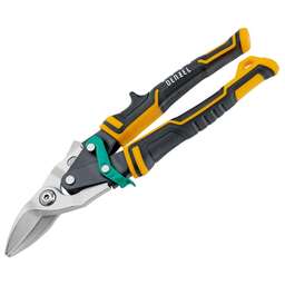 Ножницы по металлу Denzel 78371 общей длиной 270 мм, из стали-CrMo, с трехкомпонентными рукоятками, предназначены для прямого и правого реза листовых металлических заготовок и металлопрофиля толщиной до 1,2 мм. Инструмент с усиленной конструкцией осевого шарнира рассчитан на профессиональное использование. Ножницы используются для проведения строительных, кровельных и слесарных работ. Преимущества Высокое качество исполнения — ножницы изготовлены из прочной хромомолибденовой стали методом горячей штамповки, остро заточенные кованые лезвия с насечками не соскальзывают с заготовок. Эффективность — режущие кромки закалены до твердости 60-62 HRC и легко справляются даже с прочной «нержавейкой». Безопасность — блокировочный замок предотвращает случайное раскрытие лезвий во время транспортировки и хранения. Комфортная работа — плоский соединительный винт не цепляется за заготовки, удлиненные трехкомпонентные рукоятки не выскальзывают из руки. Удобное хранение — на рукоятке имеется проушина для подвешивания на крючок или гвоздь.