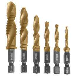 Набор сверл-метчиков Denzel 76781 состоит из 6 предметов, изготовленных из стали P6M5, и позволяет сверлить глухие и сквозные отверстия в чугуне, стали, алюминии, меди, бронзе с одновременным нарезанием правой метрической резьбы размером M4-M12 с шагом 0,7-1,75 мм. Такое решение позволяет существенно сократить время работы. Угол заточки оснастки 135° оптимален для эффективного решения поставленных задач. Сверлам-метчикам присвоен класс точности 4H, что обеспечивает высокое качество получаемой резьбы. Благодаря высококачественному исполнению сверла-метчики прослужат в 10 раз дольше аналогов из углеродистой стали. Преимущества Высокая производительность в течение длительного времени — оснастка изготовлена из прочной быстрорежущей стали. Повышенная износостойкость — нитридтитановое покрытие защищает сверла-метчики от повреждений и уменьшает трение. Быстрое засверливание — благодаря подточенной поперечной кромке каждого сверла-метчика можно приступать к работе без предварительной разметки поверхности (накернивания). Четкая маркировка — лазерная гравировка с обозначением типоразмера упрощает поиск нужной оснастки. Надежная фиксация — шестигранные хвостовики не проворачиваются в патроне электроинструмента.