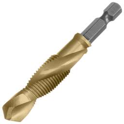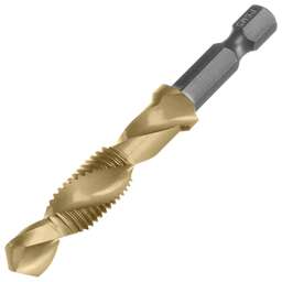 Сверло-метчик Denzel 76723 из стали P6M5 предназначено для получения глухих и сквозных отверстий в металлических заготовках с одновременным нарезанием правой резьбы M8 с шагом 1,25 мм. Позволяет существенно сэкономить время работы, объединив две операции в одну. Угол заточки 135° оптимален для работы с чугуном, сталью, алюминием, медью, бронзой. Ресурс оснастки увеличен в 10 раз по сравнению с аналогичными моделями из углеродистой стали. Преимущества Прочность — оснастка из быстрорежущей стали обеспечивает высокую эффективность работы в течение длительного времени. Долговечность — нитридтитановое покрытие защищает от повреждений и уменьшает трение, что увеличивает устойчивость сверла-метчика к износу. Быстрое засверливание — благодаря подточенной поперечной кромке можно приступать к работе без предварительной разметки поверхности (накернивания). Высокое качество выполняемых работ — сверлу-метчику присвоен класс точности 4H. Удобный поиск среди других инструментов — на хвостовик нанесена лазерная гравировка с обозначением типоразмера. Надежная фиксация — шестигранный хвостовик не проворачивается в патроне электроинструмента.