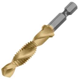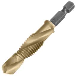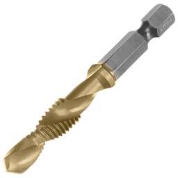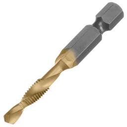 Сверло-метчик Denzel 76722 из стали P6M5 предназначено для получения глухих и сквозных отверстий в металлических заготовках с одновременным нарезанием правой резьбы M6 с шагом 1,0 мм. Позволяет существенно сэкономить время работы, объединив две операции в одну. Угол заточки 135° оптимален для работы с чугуном, сталью, алюминием, медью, бронзой. Ресурс оснастки увеличен в 10 раз по сравнению с аналогичными моделями из углеродистой стали. Преимущества Прочность — оснастка из быстрорежущей стали обеспечивает высокую эффективность работы в течение длительного времени. Долговечность — нитридтитановое покрытие защищает от повреждений и уменьшает трение, что увеличивает устойчивость сверла-метчика к износу. Быстрое засверливание — благодаря подточенной поперечной кромке можно приступать к работе без предварительной разметки поверхности (накернивания). Высокое качество выполняемых работ — сверлу-метчику присвоен класс точности 4H. Удобный поиск среди других инструментов — на хвостовик нанесена лазерная гравировка с обозначением типоразмера. Надежная фиксация — шестигранный хвостовик не проворачивается в патроне электроинструмента.
