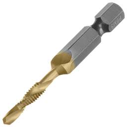 Сверло-метчик Denzel 76720 из стали P6M5 предназначено для получения глухих и сквозных отверстий в металлических заготовках с одновременным нарезанием правой резьбы M4 с шагом 0,7 мм. Позволяет существенно сэкономить время работы, объединив две операции в одну. Угол заточки 135° оптимален для работы с чугуном, сталью, алюминием, медью, бронзой. Ресурс оснастки увеличен в 10 раз по сравнению с аналогичными моделями из углеродистой стали. Преимущества Прочность — оснастка из быстрорежущей стали обеспечивает высокую эффективность работы в течение длительного времени. Долговечность — нитридтитановое покрытие защищает от повреждений и уменьшает трение, что увеличивает устойчивость сверла-метчика к износу. Быстрое засверливание — благодаря подточенной поперечной кромке можно приступать к работе без предварительной разметки поверхности (накернивания). Высокое качество выполняемых работ — сверлу-метчику присвоен класс точности 4H. Удобный поиск среди других инструментов — на хвостовик нанесена лазерная гравировка с обозначением типоразмера. Надежная фиксация — шестигранный хвостовик не проворачивается в патроне электроинструмента.