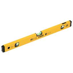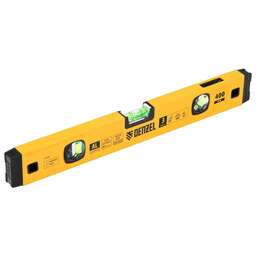 Алюминиевый фрезерованный уровень Denzel 33694 длиной 1200 мм, с магнитом и 3 глазками, из которых 1 зеркальный, предназначен для контроля отклонений от горизонтальной, вертикальной и поверхности под углом 45° с точностью 0,5 мм/м. 3 пузырьковые камеры 90°, 180° и 45° позволяют быстро проверить правильность разметки. Инструмент незаменим при проведении строительных, ремонтных, сантехнических работ. Преимущества Надежность и долговечность — корпус выполнен из прочного алюминиевого сплава. Простая фиксация на стальных поверхностях — уровень оснащен встроенными магнитами. Комфортная эксплуатация — пузырьковая камера 90° с зеркальным отражателем облегчает работу с вертикальными поверхностями. Точная работа — базовая поверхность фрезерована, что позволяет минимизировать погрешность. Удобное хранение — в корпусе предусмотрено отверстие для подвешивания инструмента. Для определения отклонения вертикали 90° необходимо использовать пузырьковую ампулу только в верхнем положении уровня. Рабочей является только базовая поверхность (противоположная ампуле 180°).