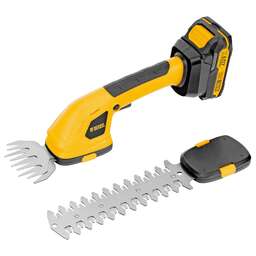 Основные характеристики Область применения - для садовых работ Тип аккумулятора - Li-Ion Назначение - для обрезки и стрижки кустов Время зарядки аккумулятора, ч - 1 Длина режущей кромки для кустарника, мм - 510 Емкость аккумулятора, Ач - 2 Индикация и дисплеи - индикатор уровня заряда аккумулятора Напряжение аккумулятора - 20 В Тип двигателя - электрический щеточный Тип ножа - двусторонний Число ходов, ход/мин - 2400 Комплектация товара Ножницы-кусторез аккумуляторные - 1 шт Лезвия для травы - 1 шт Лезвия для кустарников - 1 шт Батарея аккумуляторная System Power - 1 шт Зарядное устройство - 1 шт Руководство по эксплуатации c гарантийным талоном - 1 шт Модуль для ухода за кустами - 1 шт