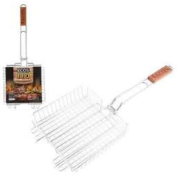 Диаметр проволоки: 3,8 мм, 2,5 мм, 1,5 мм, Материал: решетка - хромированная сталь, деревянная ручка Размер: 35 x 25 x 1.5см, Общая длина: 60 см Решетка для барбекю поможет легко приготовить вкуснейшие блюда на открытом огне. Удобная деревянная ручка не нагревается при использовании и не скользит в руках. Благодаря тому, что решетка переворачивает все содержимое одним движением, значительно экономится время при готовке. Удобный зажим прочно закрепит продукты на решетке, будь то мясо, овощи или рыба. Легко моется и прослужит долгое время.