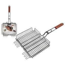 размер: 22x22x5см, общая длина: 58см Толщина прутьев: 3.5мм, 2.0мм, 1.5мм. Материал: хромированная сталь, Глубокая решетка для барбекю поможет легко приготовить вкуснейшие блюда на открытом огне. Удобная деревянная ручка не нагревается при использовании и не скользит в руках. Благодаря тому, что решетка переворачивает все содержимое одним движением, значительно экономится время при готовке. Удобный зажим прочно закрепит продукты на решетке, будь то мясо, овощи или рыба.