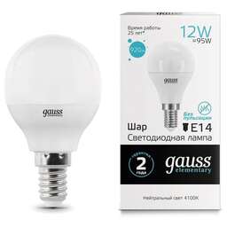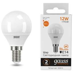 Бренд: GAUSS Тип товара: светодиодная PartNumber/Артикул Производителя: 53112 Энергосберегающая: ДА Описание: Светодиодная лампа Gauss - безопасный для здоровья и окружающей среды источник света. Она не пульсирует, мгновенно включается, не содержит ртути и имеет больший срок службы, чем лампы накаливания и КЛЛ, экономичнее ламп накаливания до 10 раз. Матовая: ДА Класс энергоэффективности: A+ Световой поток: 880 lm Максимальный срок службы: 25000 ч Угол светового пучка: 240 ° Габариты упаковки (ед) ДхШхВ: 0.23x0.17x0.05 м Вес упаковки (ед): 0.51 кг Объем упаковки (ед): 0.001955 м3 Серия: Elementary Патрон: E14 Количество ламп: 10 шт Цветовая температура: 3000 К Цвет свечения: белый теплый Индекс цветопередачи: 80 Тип лампы: светодиодная Степень защиты: IP20 Мощность: 12 Вт Напряжение питания: 220 В
