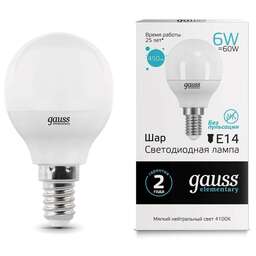 Бренд: GAUSS Колба: C37 Тип товара: светодиодная PartNumber/Артикул Производителя: 33126 Энергосберегающая: ДА Класс энергоэффективности: A+ Матовая: ДА Описание: Светодиодная лампа Gauss - безопасный для здоровья и окружающей среды источник света. Она не пульсирует, мгновенно включается, не содержит ртути и имеет больший срок службы, чем лампы накаливания и КЛЛ, экономичнее ламп накаливания до 10 раз. Световой поток: 450 lm Максимальный срок службы: 25000 ч Угол светового пучка: 240 ° Вес упаковки (ед): 0.35 кг Серия: Elementary Патрон: E14 Количество ламп: 10 шт Цветовая температура: 4100 К Цвет свечения: белый нейтральный Индекс цветопередачи: 80 Тип лампы: светодиодная Степень защиты: IP20 Мощность: 6 Вт Габариты упаковки (ед) ДхШхВ: 0.19x0.19x0.035 м Объем упаковки (ед): 0.0012635 м3 Напряжение питания: 220 В